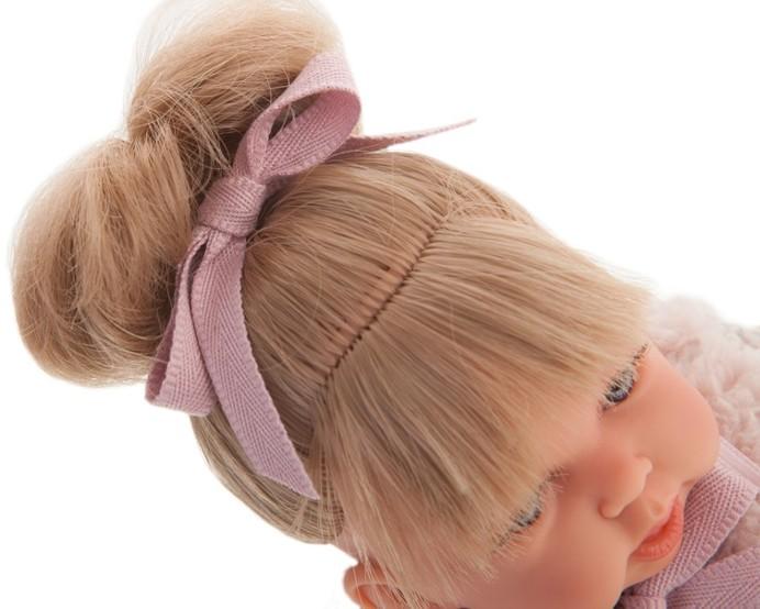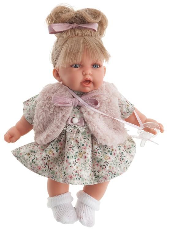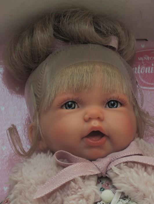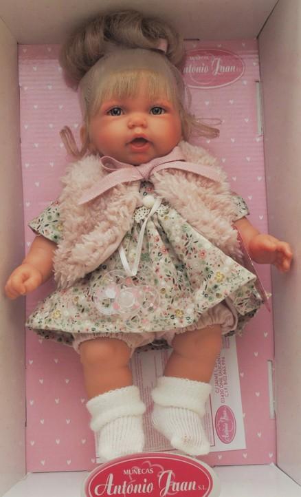 Bábika Petit Chaleco je vyrobená v Španielsku firmou Antonio Juan. Bábika je 27 cm dlhá, má mäkké-látkové telíčko, hlavička a končatiny sú vyrobené z kvalitného mäkčeného vinylu. Bábika má svetlé vlásky zviazané ružovou mašľou do drdolu. Bábika má v sebe strojček, vďaka ktorému po stlačení vydává zvuky. Má modré nežmurkajúce oči. Bábika je oblečená do šatiček s drobnými kvetovými vzormi, cez ktoré má oblečenú huňatú ružovú vestu zviazanú mašľou. Na nožičkách má biele ponožky.