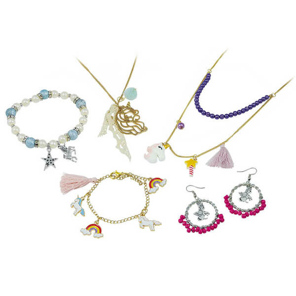 Obsahom sady je niekoľko bižutérnych komponentov, retiazky, bavlnené šnúrky, strapce, kovové prívesky s motívom jednorožcov a ilustrovaný návod na používanie. Výsledkom vašej práce bude až 5 rozličných šperkov – 2 náhrdelníky, 2 náramky a náušnice.