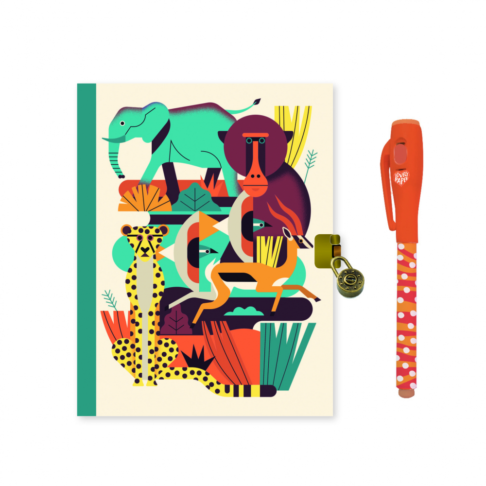 To, čo si zapíšeš do tohto tajného zápisníka si nikto len tak ľahko neprečíta. Zvonka jeho obsah chráni malá visacia zámka na kľúčik. Zápisky si môžeš robiť špeciálnym perom s neviditeľným atramentom, ktorý sa zviditeľní len pod UV svetlom. UV baterka s vypínačom je zabudovaná vo vrchnáku pera. Obálku zápisníka zdobí obrázok afrických zvierat, v tichom pohybe a v nemom sede – videli, vedia, no nepovedia.