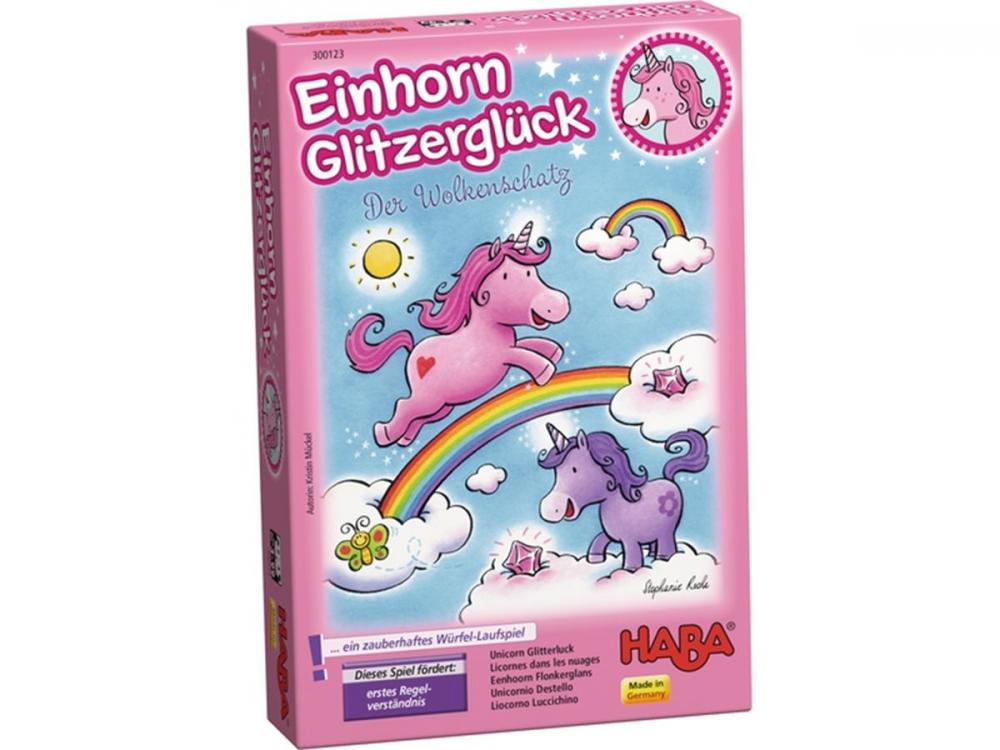1 herný plán, 1 ružový jednorožec Glitterluck, 1 žltý jednorožec Stardust, 1 fialový jednorožec Marvel Flower, 1 tyrkysový jednorožec Magic Swirl,? 60 kryštálov oblakov, 1 ružová kocka s krištáľovými symbolmi, 1 modrá kocka so symbolmi mraku, sada hry inštrukcie. Filozofia značky HABA je založená na jednoduchom princípe: Deti sú tá najdôležitejšia vec v živote! Vštepovanie základných životných hodnôt, pomoc deťom v ich rozvoji a nezávislosti, podpora ich kreativity a predstavivosti nie je úloha len pre rodičov. HABA ponúka hračky a hry špeciálne navrhnuté pre jednotlivé vekové štádiá vývinu detí. HABA rozvíja a stimuluje vnemy, predstavivosť, kreativitu, motoriku, sociálnu hru. Hračky HABA sú pravidelne oceňované nielen za kvalitu a funkcionalitu, ale aj za svoj krásny dizajn.