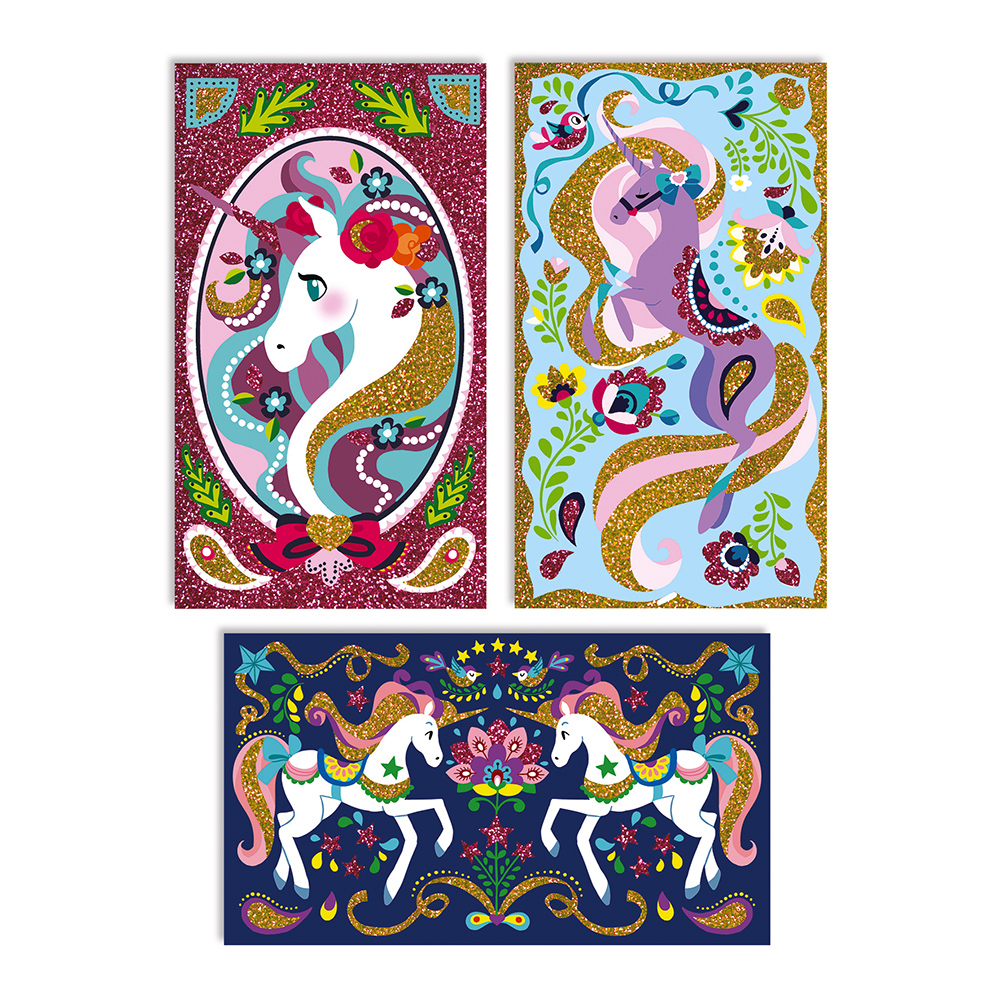 Kreatívna sada Jednorožec farebný piesok s trblietkami obsahuje 3 karty na dotvorenie, ktoré treba dozdobiť a dotvoriť krásnymi farebnými pieskami, balenie obsahuje 3 karty, 2 tuby piesku a jednu špachtličku.