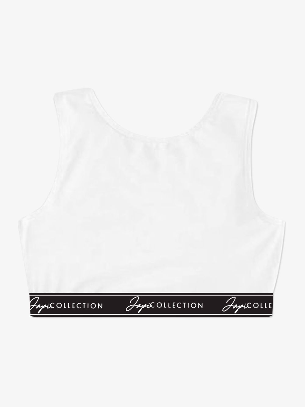 Dievčenský crop top v bielej farbe s čiernou gumou.