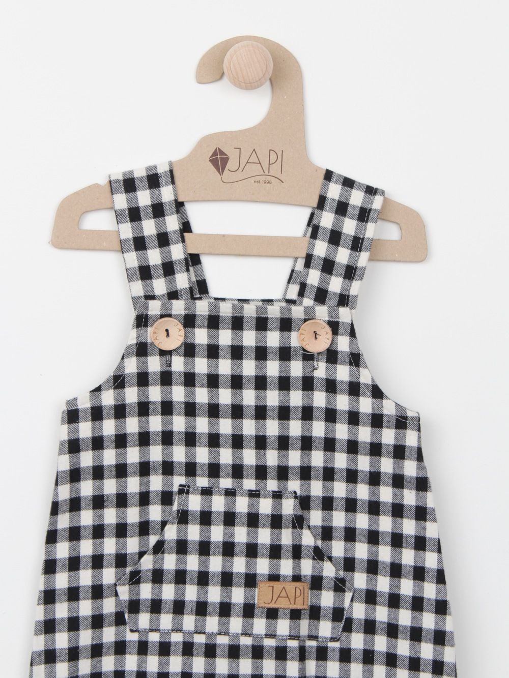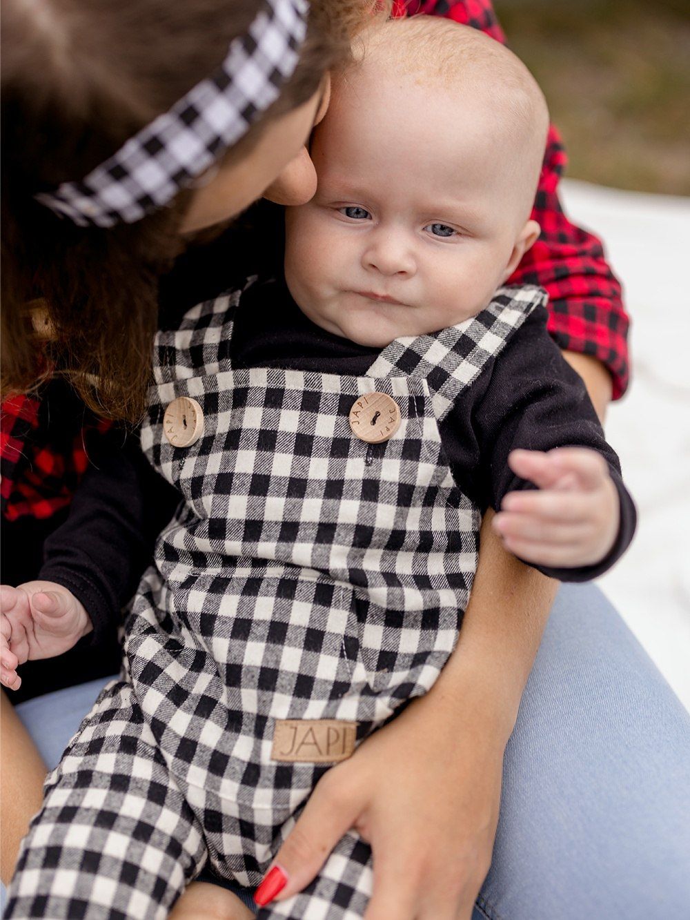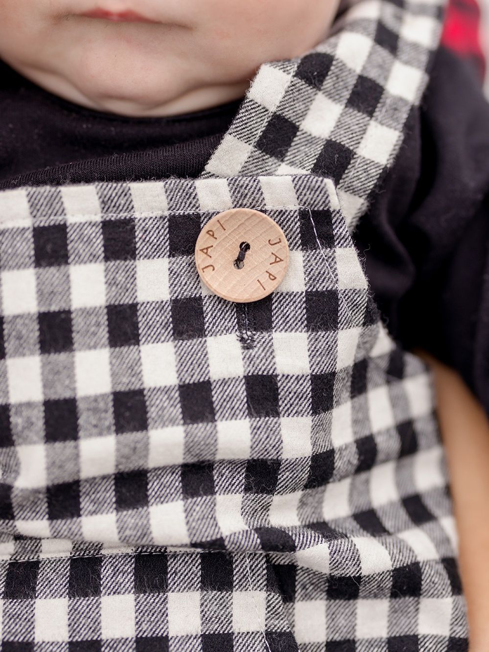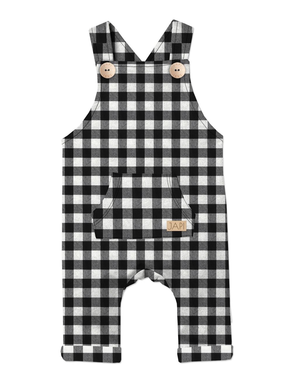 Chutné, pohodlné a najmä teplučké tepláčiky na traky z bavlneného flanelu si zamilujete. Zapínanie na drevené gombíky a nestarnúce káro tvoria zohranú dvojku. Vďaka praktickému pudlovému strihu do nich jednoducho oblečiete bábätko s plienkou. Celkový vzhľad dotvára klokanie vrecko a kožená nášivka.