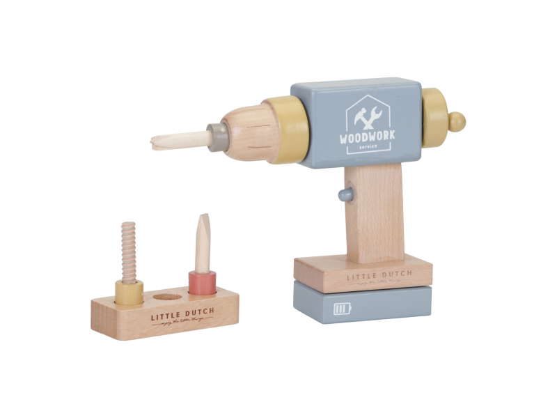 S touto drevenou vŕtačkou váš malý opravár zvládne opraviť takmer čokoľvek. Vŕtačka ponúka 3 výmenné nástavce na vŕtanie aj skrutkovanie. Otáčaním kolieska vzadu sa roztáča aj vrták alebo skrutkovač. Na spodnej časti vŕtačky je suchým zipsom upevnená drevená “batéria”.