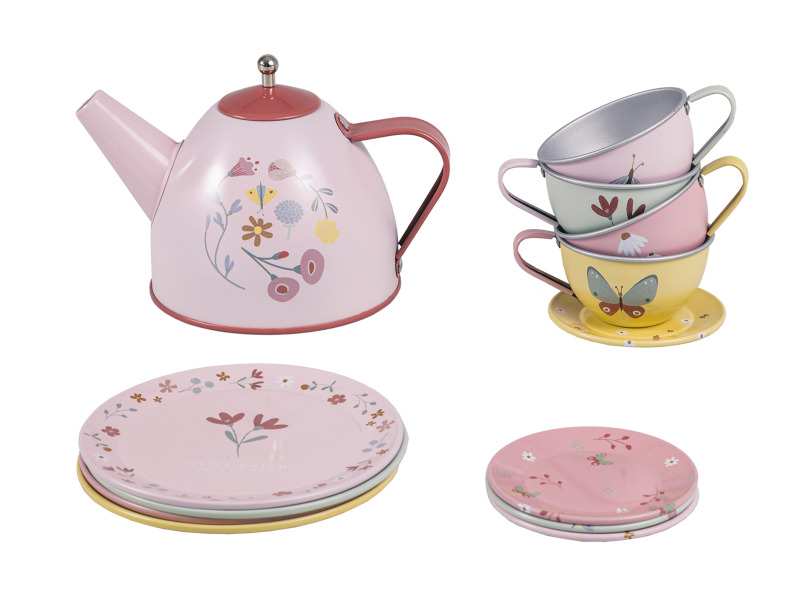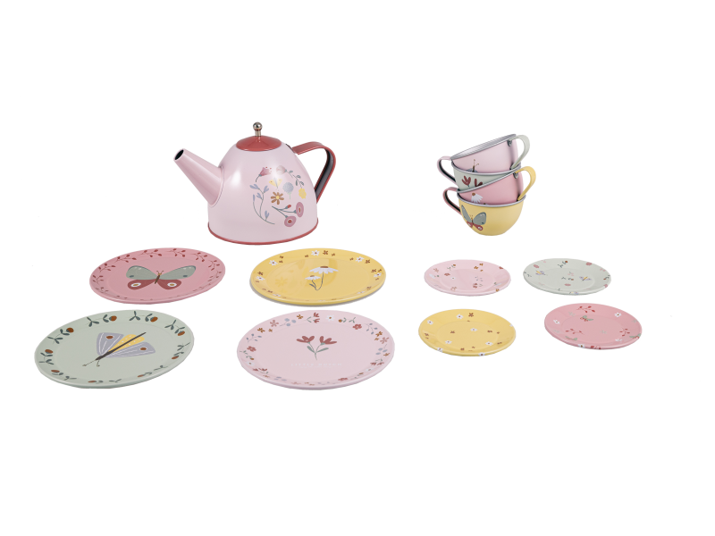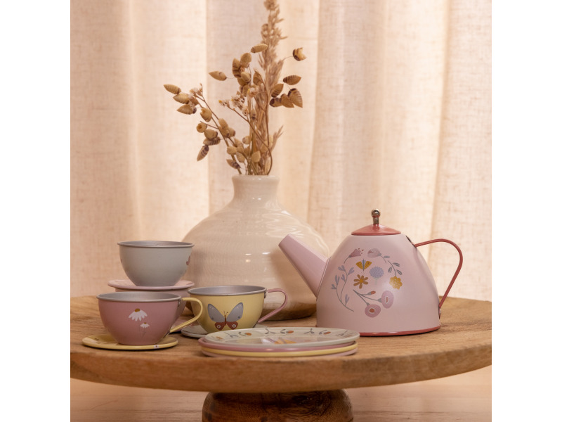 Neodolateľná sada čajovej konvičky a štyroch hrnčekov s tanierikmi s krásnymi motívmi kolekcie Kvety a motýle poteší malú hostiteľku či hostiteľa pri organizovaní čajového večierka pre bábiky alebo pre kamarátov.