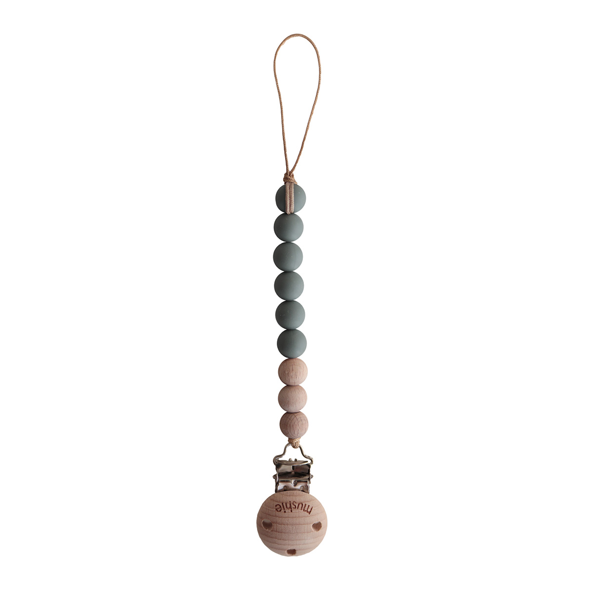 Farebné silikónové korálky sú vyrobené zo 100% potravinárskeho silikónu, ktorý neobsahuje BPA a ani iné toxíny. Drevené korálky sú vyrobené z čistého prírodného dreva bez akéhokoľvek ďalšieho chemického ošetrenia. Kovová časť klipu je bez obsahu niklu a olova.