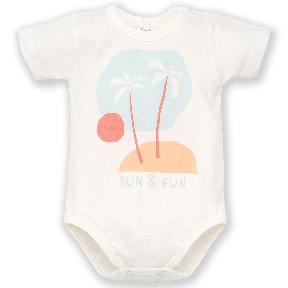 Detské bavlnené body s krátkym rukávom, ktoré majú patentky medzi nožičkami pre rýchlu výmenu plienočky a ďalšie dve patentky na ramene pre jednodnoduchšie prezliekanie.
