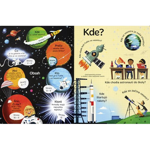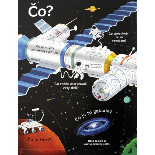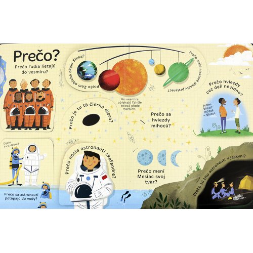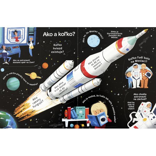 dozvieme? Aký je rozdiel medzi astronautom a kozmonautom? Chceš vedieť, či sa aj ty môžeš stať vesmírnym objaviteľom? Všetky otázky a odpovede o vesmíre, hviezdach, planétach a galaxiách, ktoré ti napadnú, nájdeš v tejto bohato ilustrovanej detskej encyklopédii. Odpovede sa ukrývajú pod odklápacími okienkami, takže môžeš knihu čítať znova a znova a zisťovať, či už si sa o vesmíre to podstatné naučil. 3, 2, 1…ŠTART! Tvoja cesta za poznaním sa práve začína!