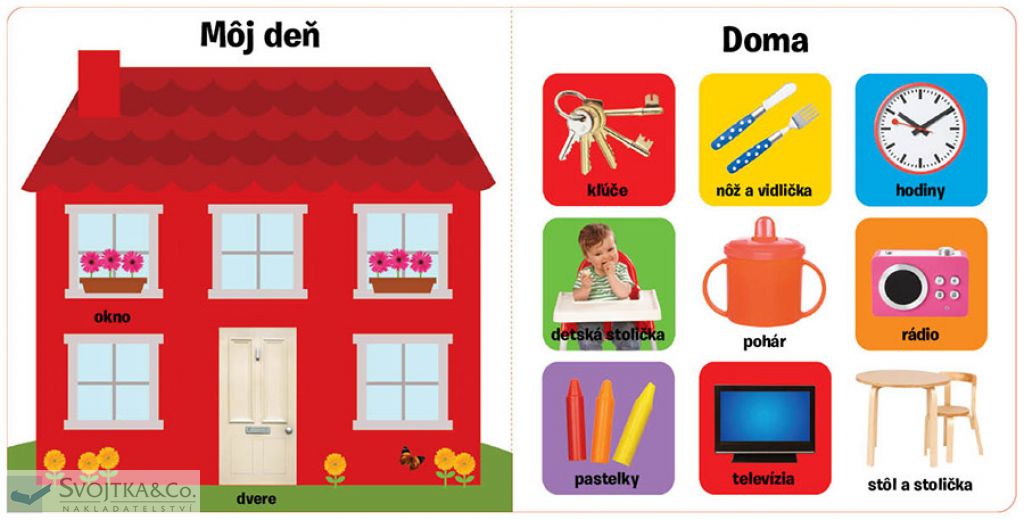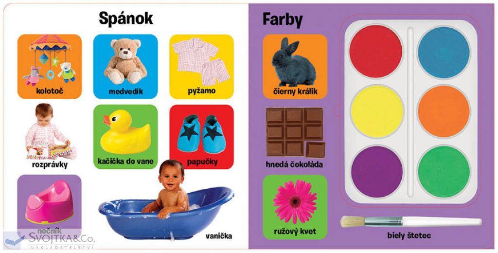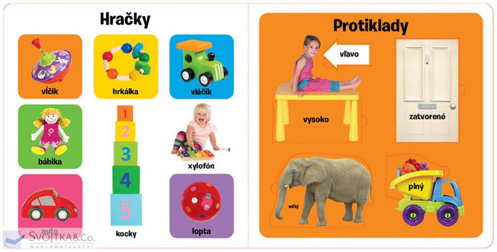 Táto knižka je ideálnou voľbou pre rodičov, ktorých deti sa práve rozhovoril a zvládli prvé slovíčka. Obsahuje rozšírenie základnej slovnej zásoby vo všetkých najdôležitejších oblastiach, ktoré by malo dieťa poznať – spoznávať aj aktívne používať. Na mnohých farebných fotografiách s menovkami tu nájdete vyobrazený priebeh dňa – čo robíme ráno a čo večer, keď ideme spať, čo jeme, s čím sa hráme pod. Deti sa naučia rozoznávať tvary a farby a vyhľadávať ich na predmetoch v celej knižke. Ďalšie stránky sú venované číslam alebo zvieratám, a to ako domácim, tak divým, dospelým aj mláďatám. Knižka obsahuje veľké množstvo okienok, ktoré ponúkajú najrôznejšie aktivity, ako napr. rozlišovanie protikladov alebo precvičovanie pamäti. To všetko na mnohých pestrých a zábavných stránkach, ktoré sú pevné, takže ich neohnú ani ručičky tých „náruživejších“ malých čitateľov.