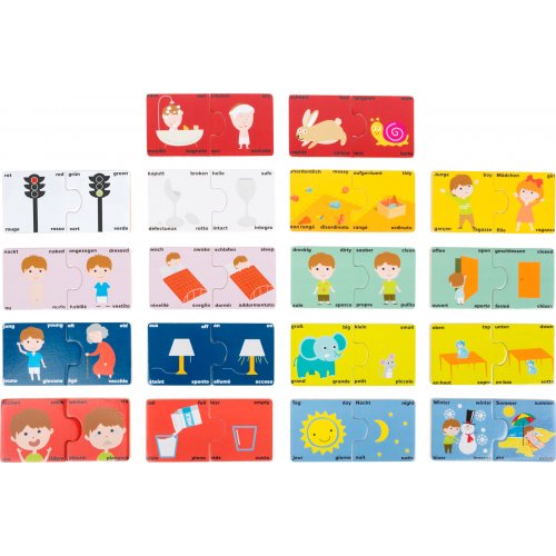 Aký je protiklad “svetla”? S týmto dreveným, edukatívnym puzzle sa deti hravo dozvedia veľa o protikladoch. Puzzle obsahuje 18 tém, ktoré sú nádherne ilustrované a deti sa s ním môžu hrať aj ako pamäťovú hru. Puzzle podporuje koncentráciu, jemné motorické zručnosti a komunikatívnosť. Farebné doštičky sú vytvorené s kvalitných a pevných materiálov, ktoré zaručujú, že sa s nimi Vaše detičky budú hrať čo najdlhšie.