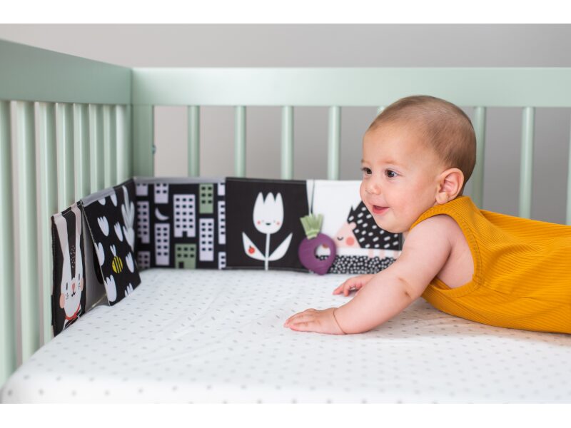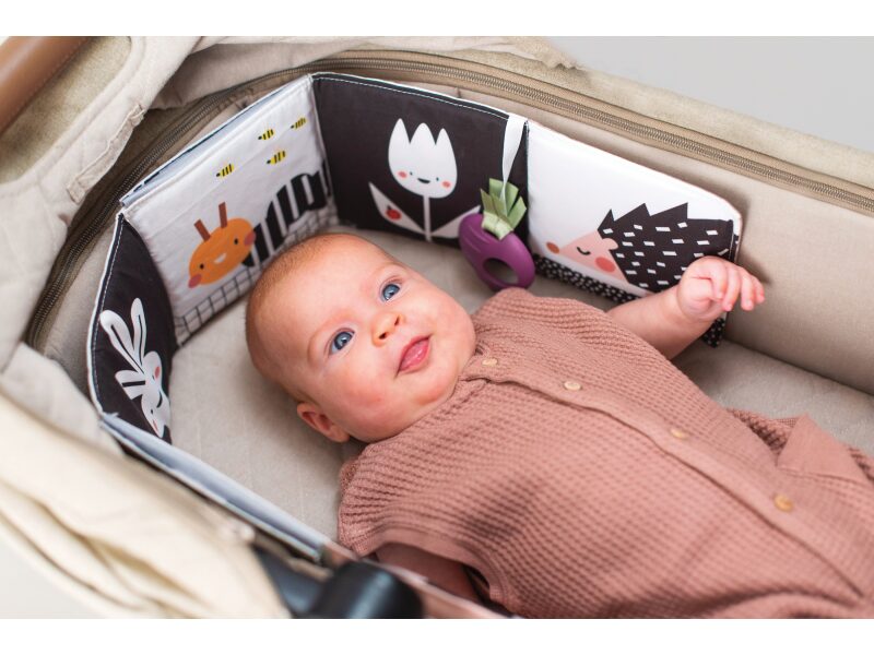 • Od 3 mesiacov: strana farebnými obrázkami, bezpečným zrkadlom, hryzátkom a rôznorodými textúrami na skúmanie, ktoré podporujú rozvoj zmyslov a jemnej motoriky dieťaťa.