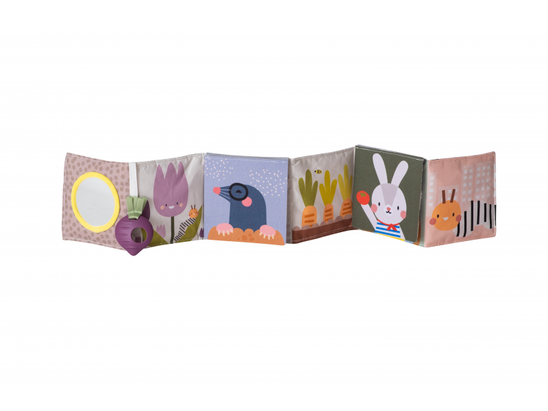 Knižka drží postavená samostatne pre hru na brušku alebo je možné ju pripevniť pomocou plastových klipov na postieľku či do kočíka.
